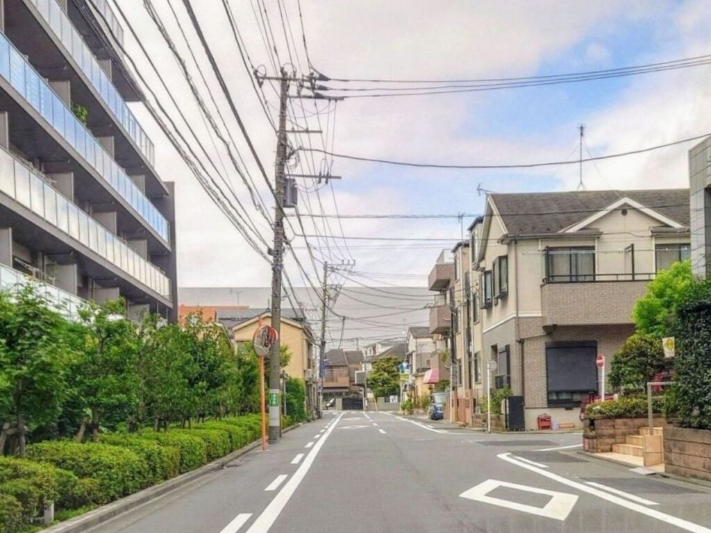 歩道がない幅員の狭い道路で、歩行者の通行スペースを確保するために白線によって道路端が区分された部分