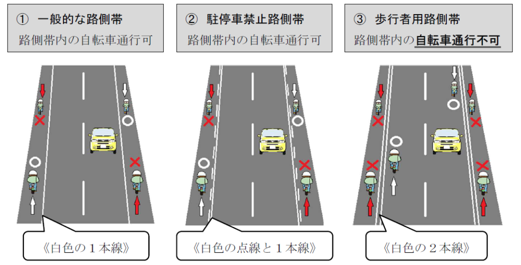 著しく歩行者の通行を妨げる場合を除き、道路左側部分に設けられた路側帯(下図①,②)を通行することができます👌