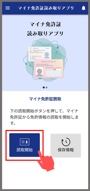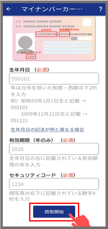 生年月日(6桁)、有効期限西暦(4桁)、セキュリティコード(4桁)を入力後「読取開始」をタップ