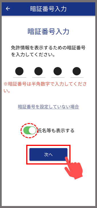 マイナ免許証取得時に設定した暗証番号(4桁)を入力して「次へ」をタップ