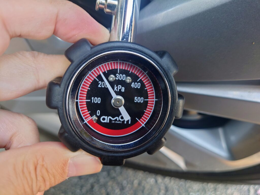 自転車と違い、目視しただけではどれくらい減っているかわからないので、必ずタイヤ空気圧を計測するエアゲージで測定しましょう⏱